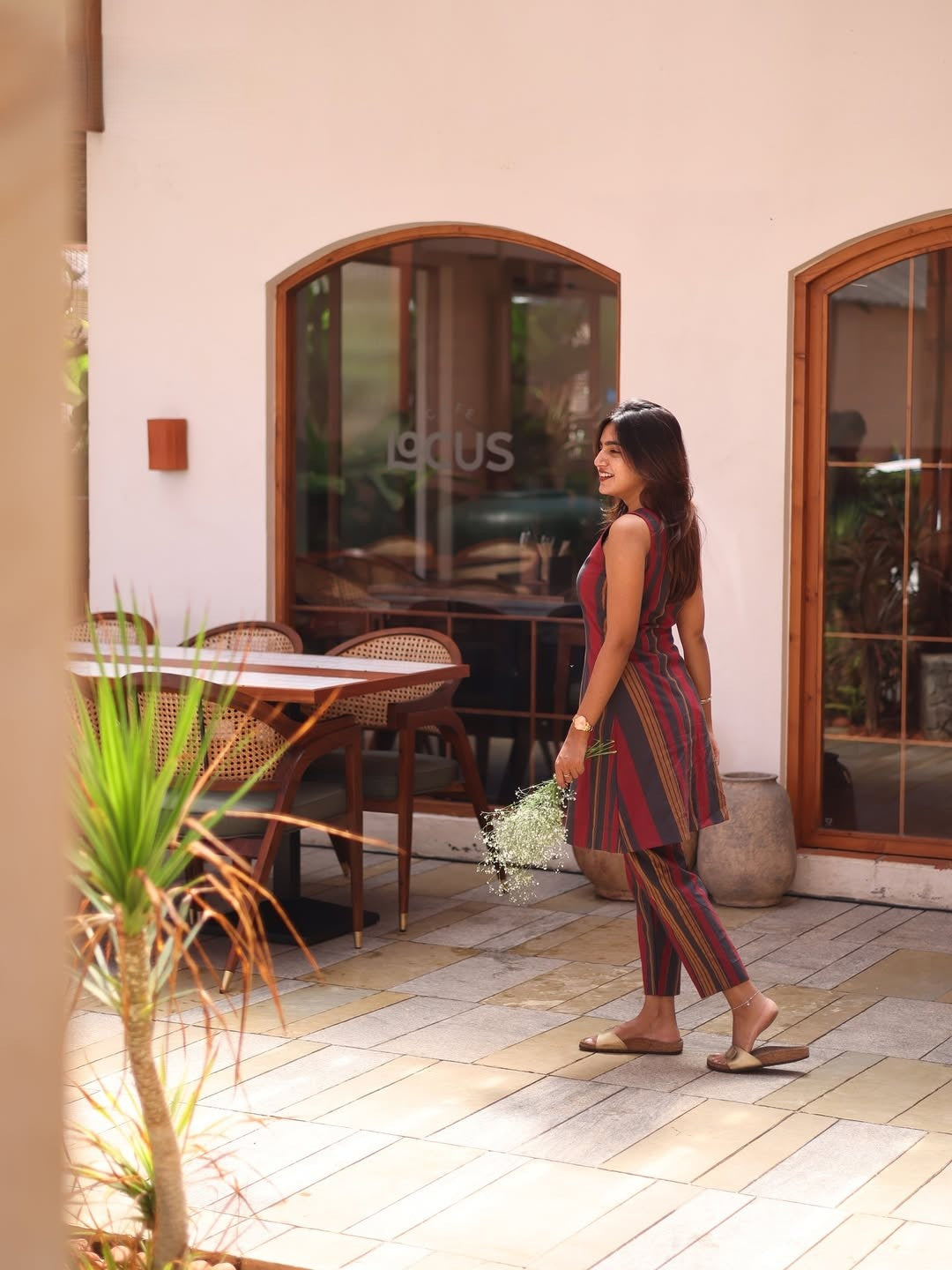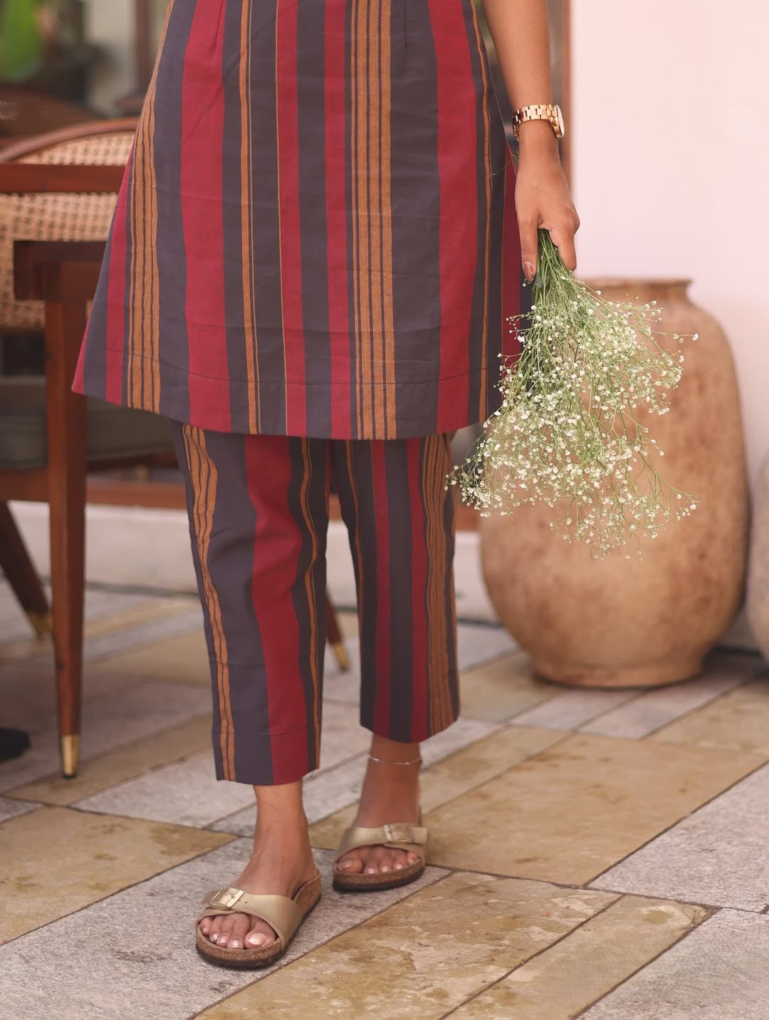 Elevate your everyday style with this striking Black & Maroon Stripes Kurti Set, designed for the modern woman who values comfort without compromising on elegance. The sleeveless tunic features bold vertical stripes in black, maroon, mustard creating a flattering, elongated silhouette. Paired with matching straight-fit pants, this co-ord set offers a cohesive look that’s both rooted and contemporary.