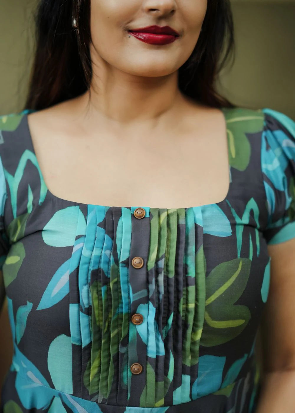 A beautiful black & blue, green abstract print muslin dress featuring wide neck, pleated yoke, short puffed sleeves, fitted waist, flared hem and button detailing at the front.