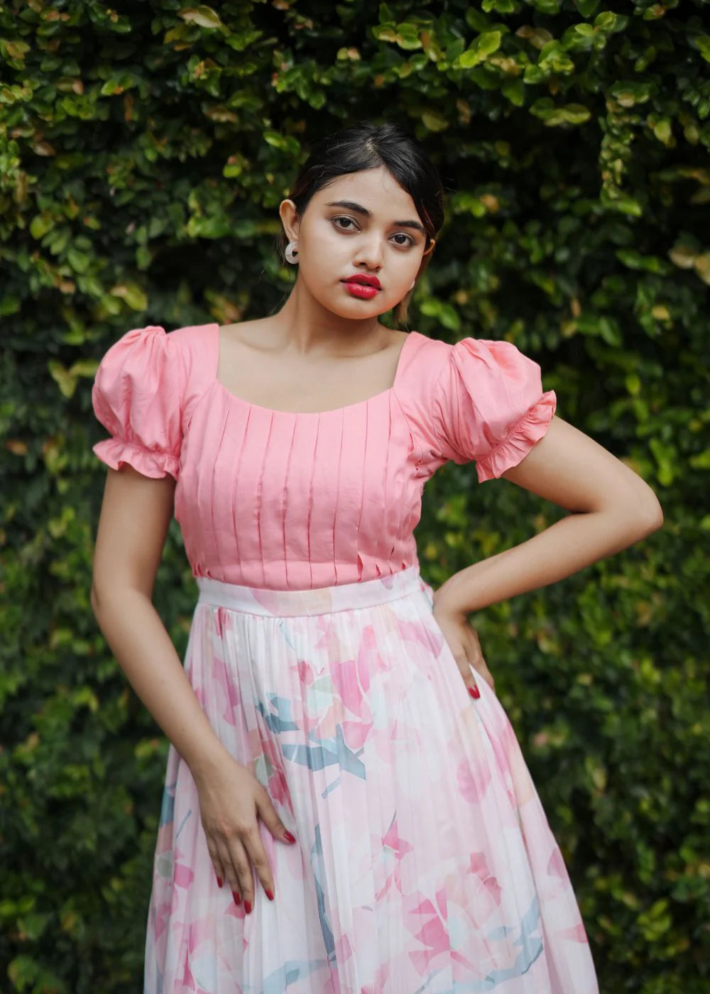 Pink Puff Sleeve Floral Fit & Flare Midi Dress