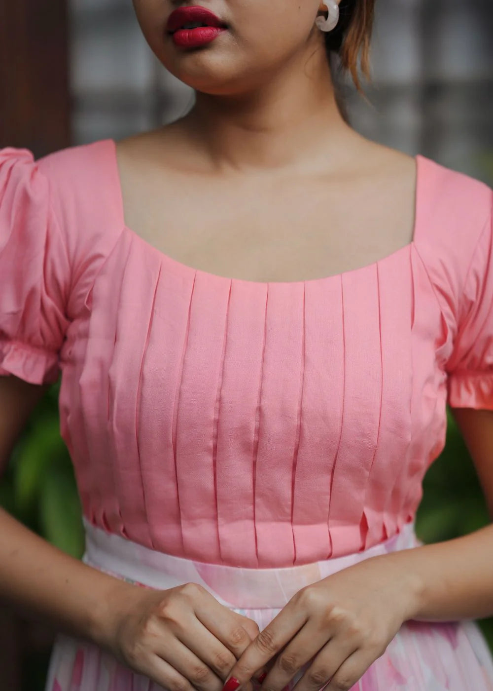 A flowy peach & cream, multicolour abstract print viscose & muslin dress featuring wide neck with pleated yoke, short puffed sleeves, fitted waist and flared hem with ruffles at the end.