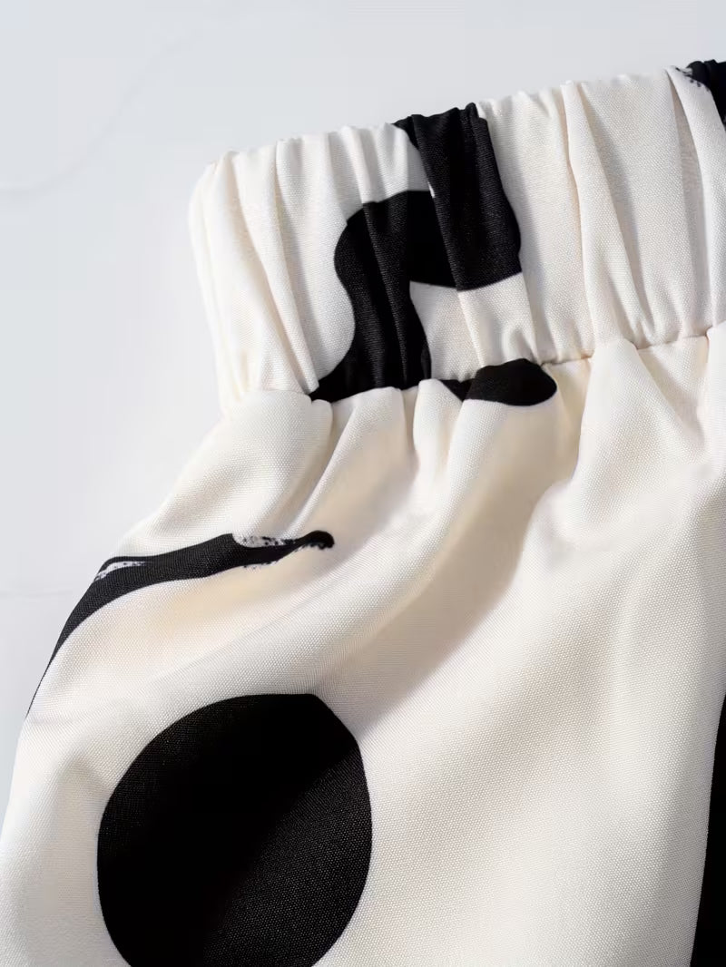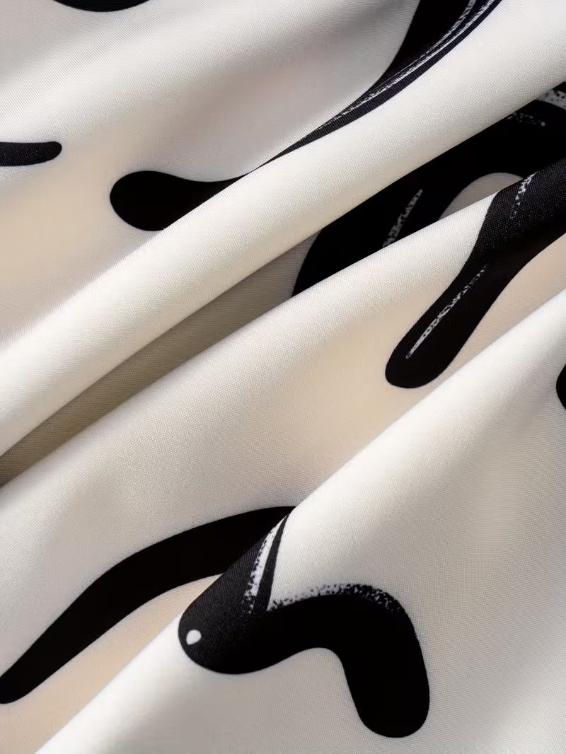 This elegant A-line maxi skirt features a striking monochromatic palette, blending timeless sophistication with a modern, artistic edge. Crafted from a smooth, fluid fabric in a soft off-white cream, it provides a clean canvas for the bold, abstract brushstroke pattern in deep black.