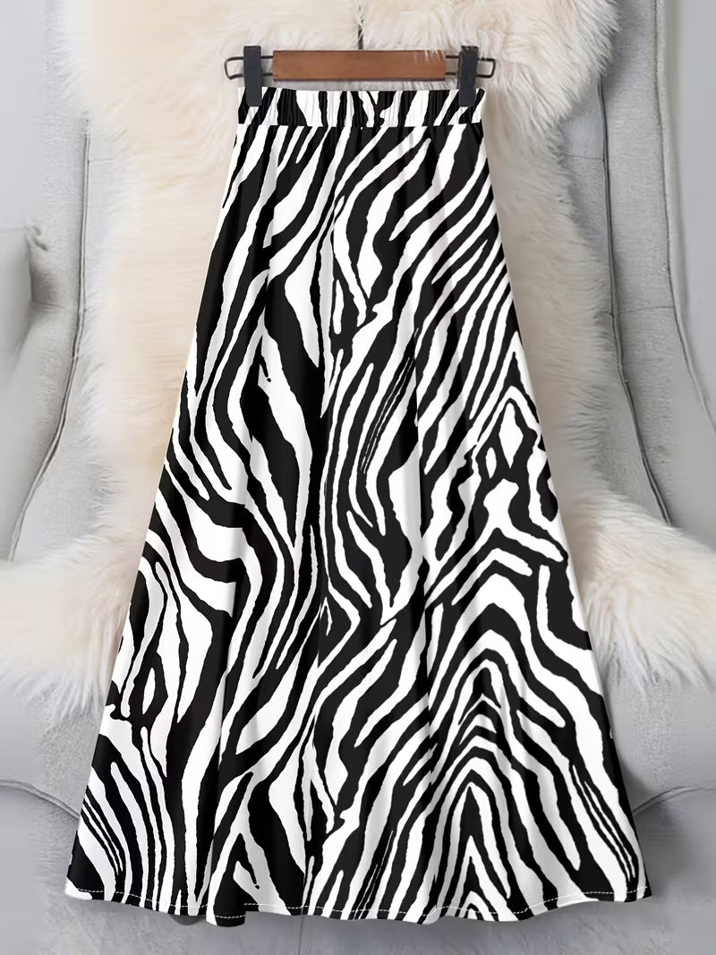 This striking A-line midi skirt features a bold, high-contrast zebra print that serves as a sophisticated statement piece. Designed with a flattering high-waisted silhouette, it cinches the waist before flowing into a graceful, flared hem. The fabric appears to be a lightweight satin or polyester crepe, offering a fluid drape and a subtle sheen that enhances movement.