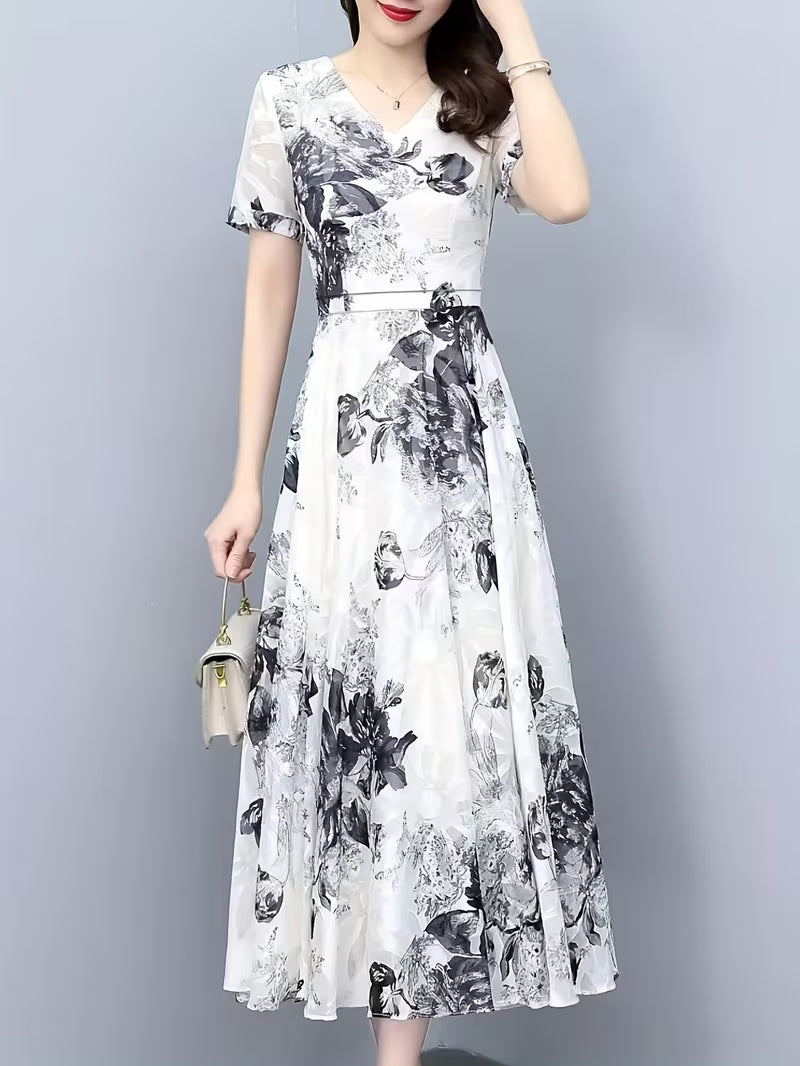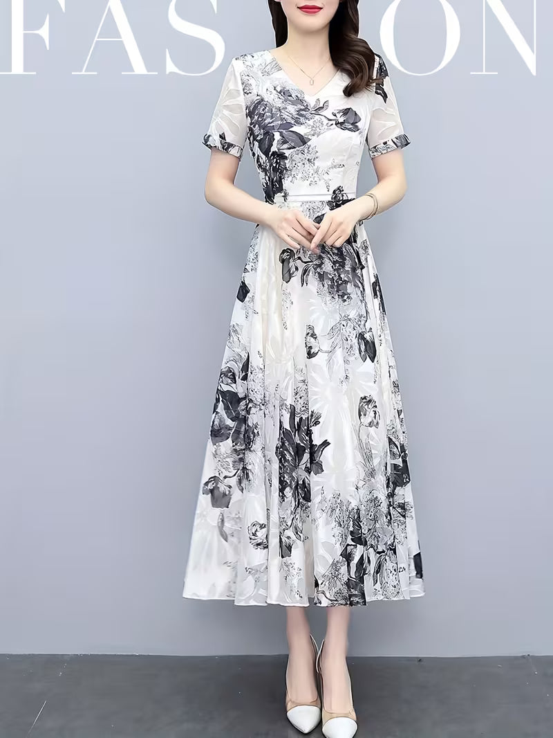 "Elevate your elegance with this stunning Monochrome Floral Midi Dress. Featuring a sophisticated ink-wash floral print on a crisp white base, this dress offers a timeless black-and-white aesthetic. The V-neckline and cinched waist create a flattering silhouette, while the sheer organza-style short sleeves