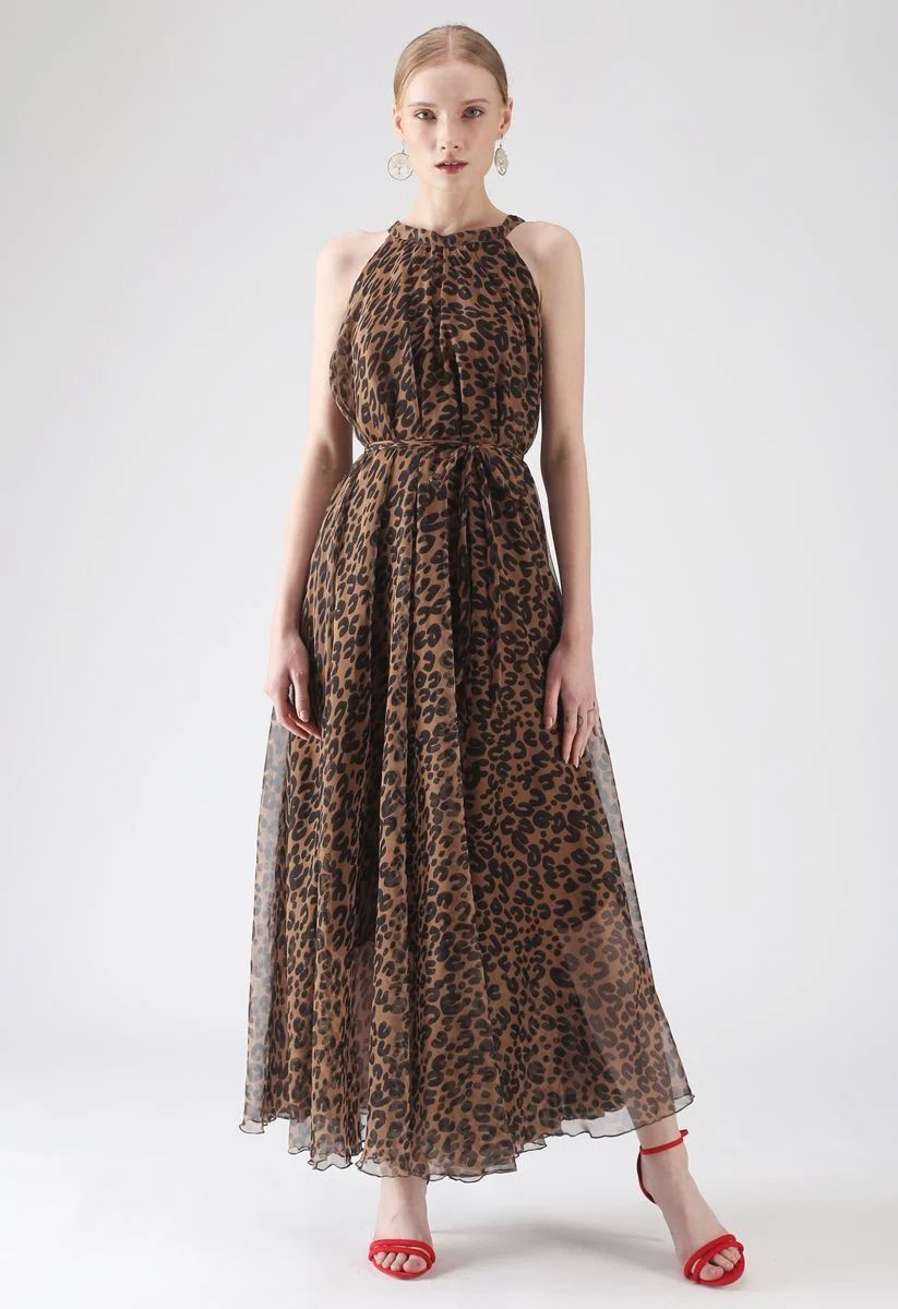 Brown Leopard Printed Poly Chiffon Maxi Dress with Halter Neckline, Waist Tie Detail & Flowing Silhouette for Resort Wear, Brunch & Evening Occasions
