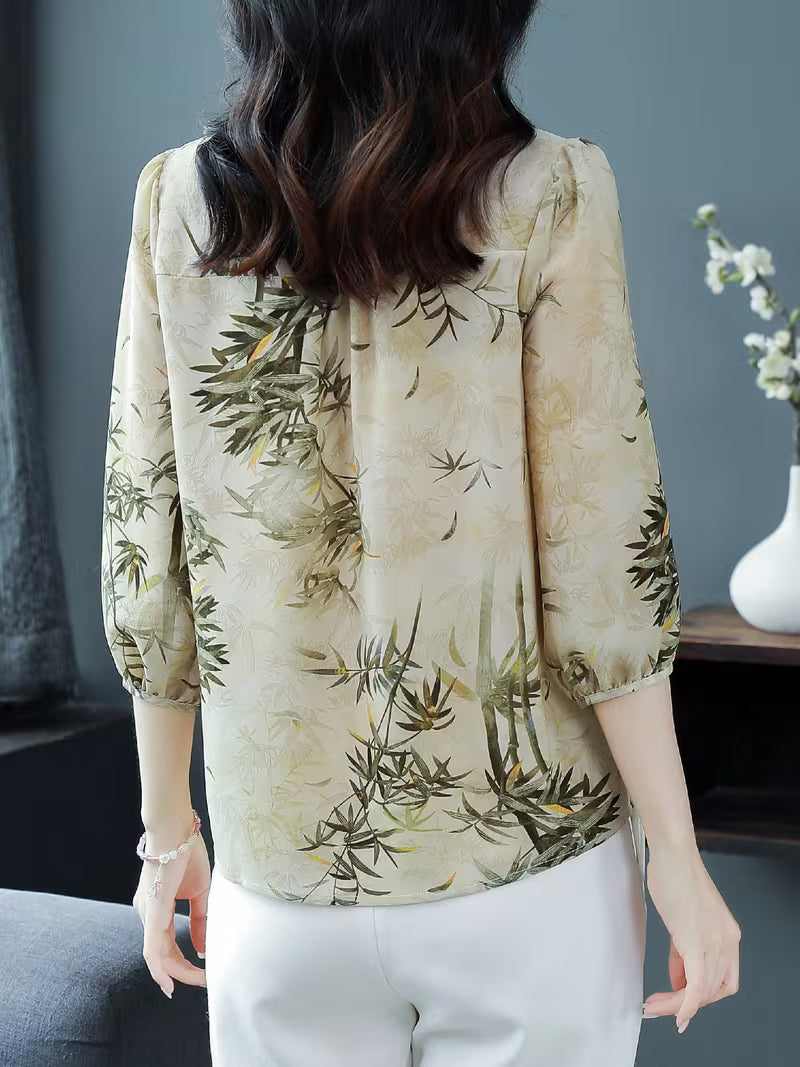 Elegant Bamboo Print Chiffon with Ruffled V-Neck and 3/4 Sleeves TOP