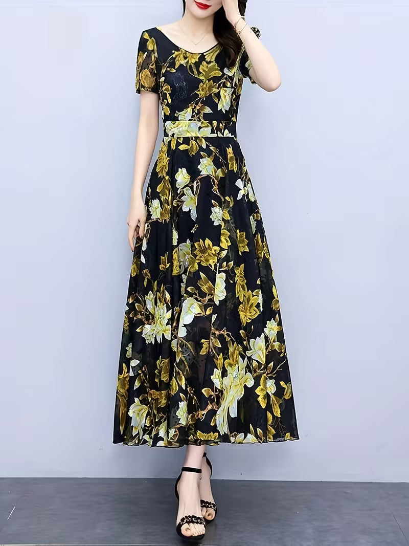 Elegant Black Chiffon Dress with Gold Foil Floral Print Dress