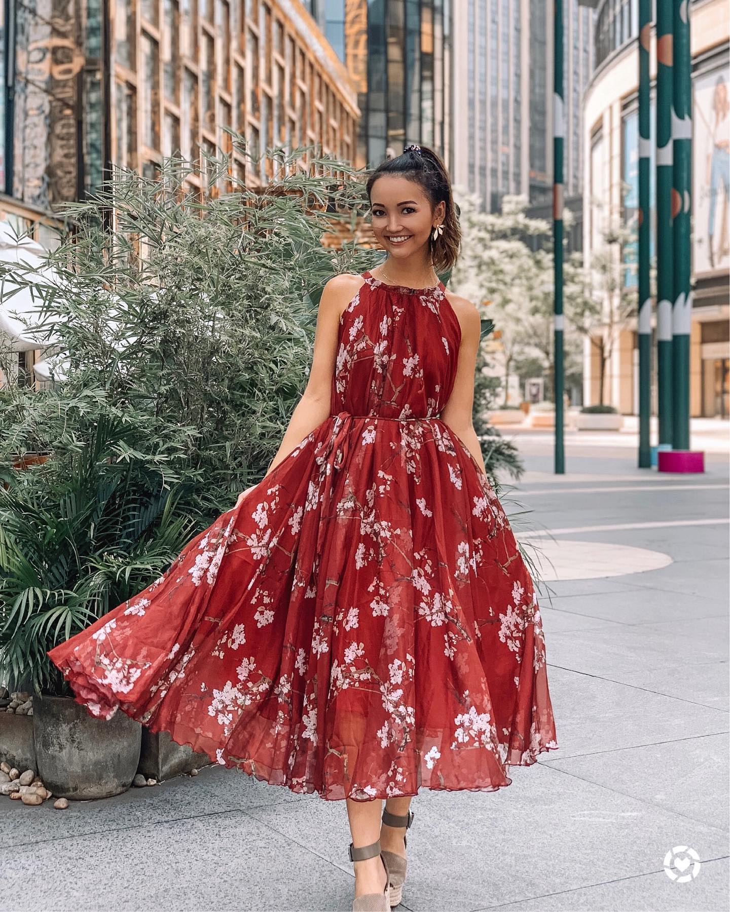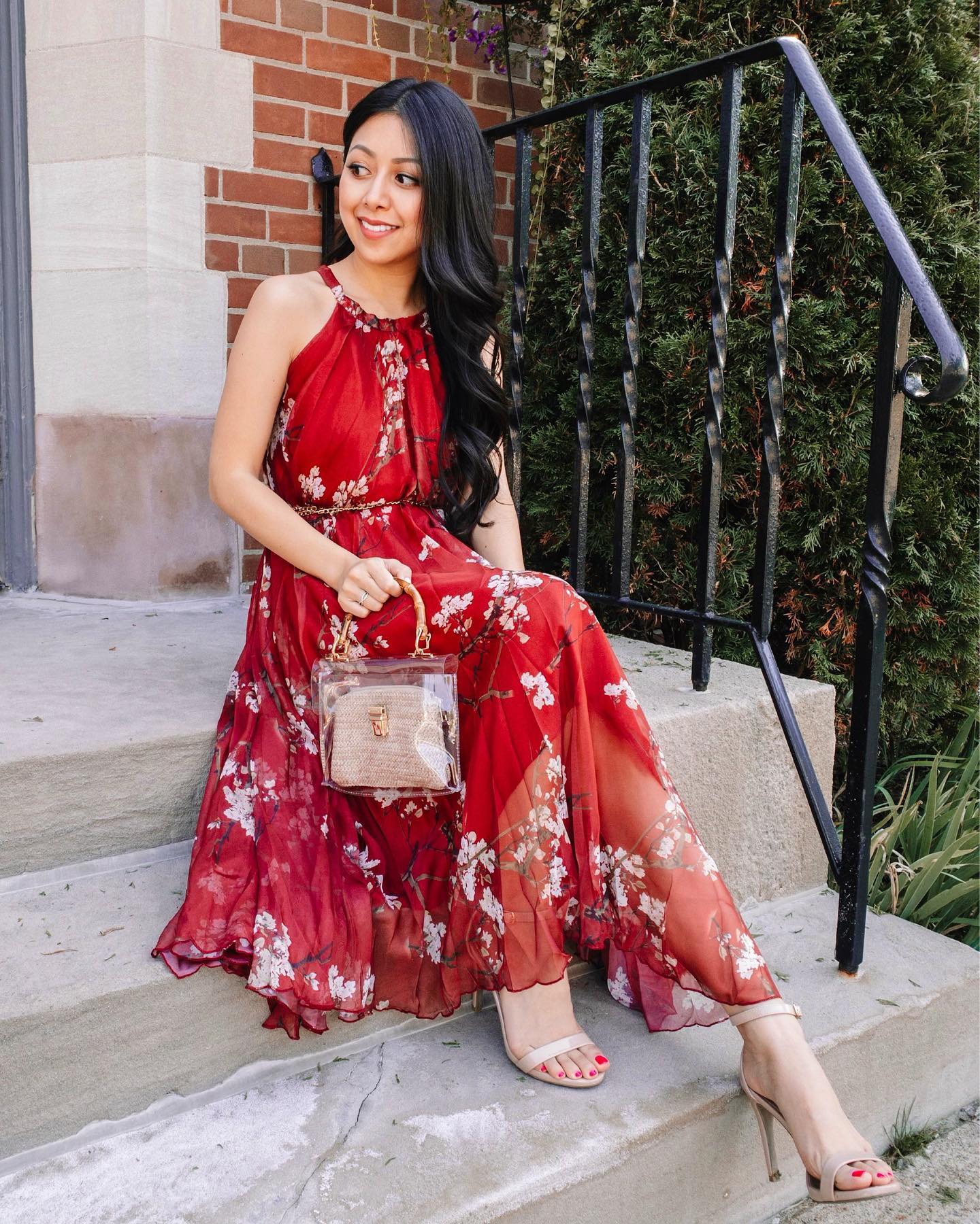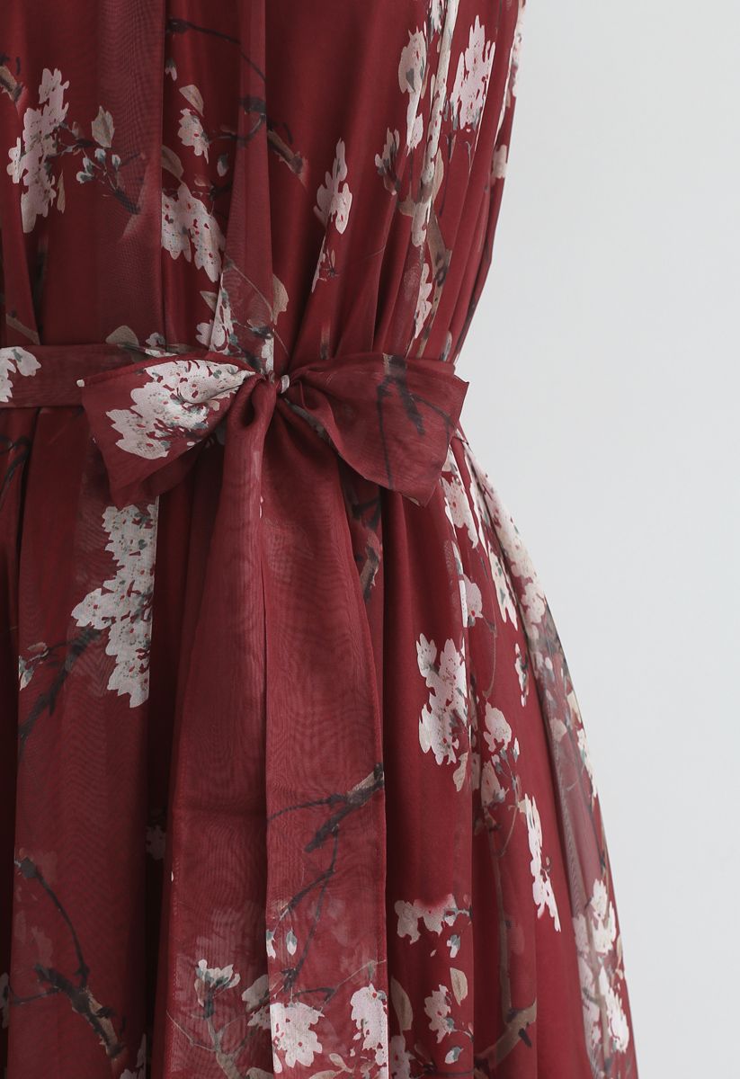 Elegant Wine Floral Printed Poly Chiffon Maxi Dress with Halter Neckline & Flowing Silhouette for Summer Brunch Resort