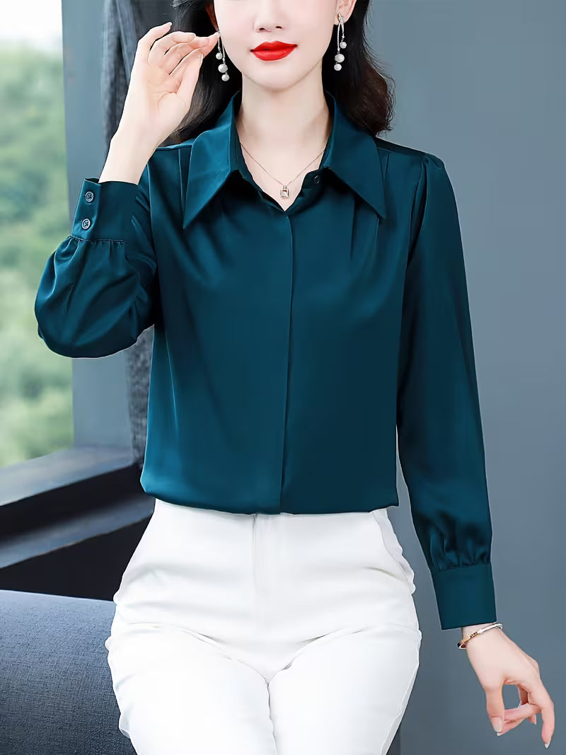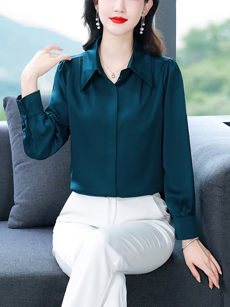 This sophisticated Shirt is crafted from premium Mulberry Silk Satin, celebrated for its liquid-like drape and luminous sheen. The fabric feels exceptionally smooth and cool against the skin, offering a breathable, lightweight experience. Its rich emerald hue and subtle natural luster create a polished, high-end look perfect for professional settings.