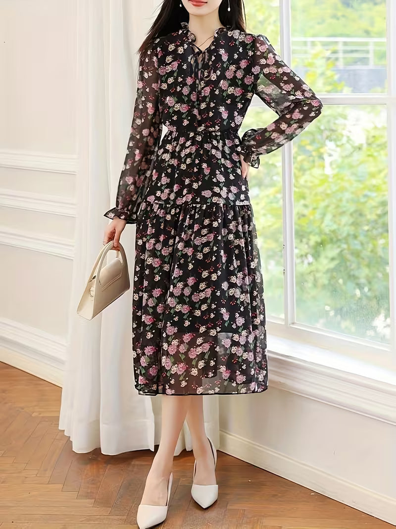 Bring timeless elegance to your wardrobe with the Midnight Bloom Floral Dress. Crafted from lightweight chiffon fabric, this dress features a delicate vintage floral print on a classic black base. The ruffled tie-up neckline and sheer full sleeves add a graceful charm, while the fit-and-flare silhouette with tiered detailing creates a beautifully flowing look. Ideal for day-to-evening wear, this dress blends comfort with effortless sophistication.