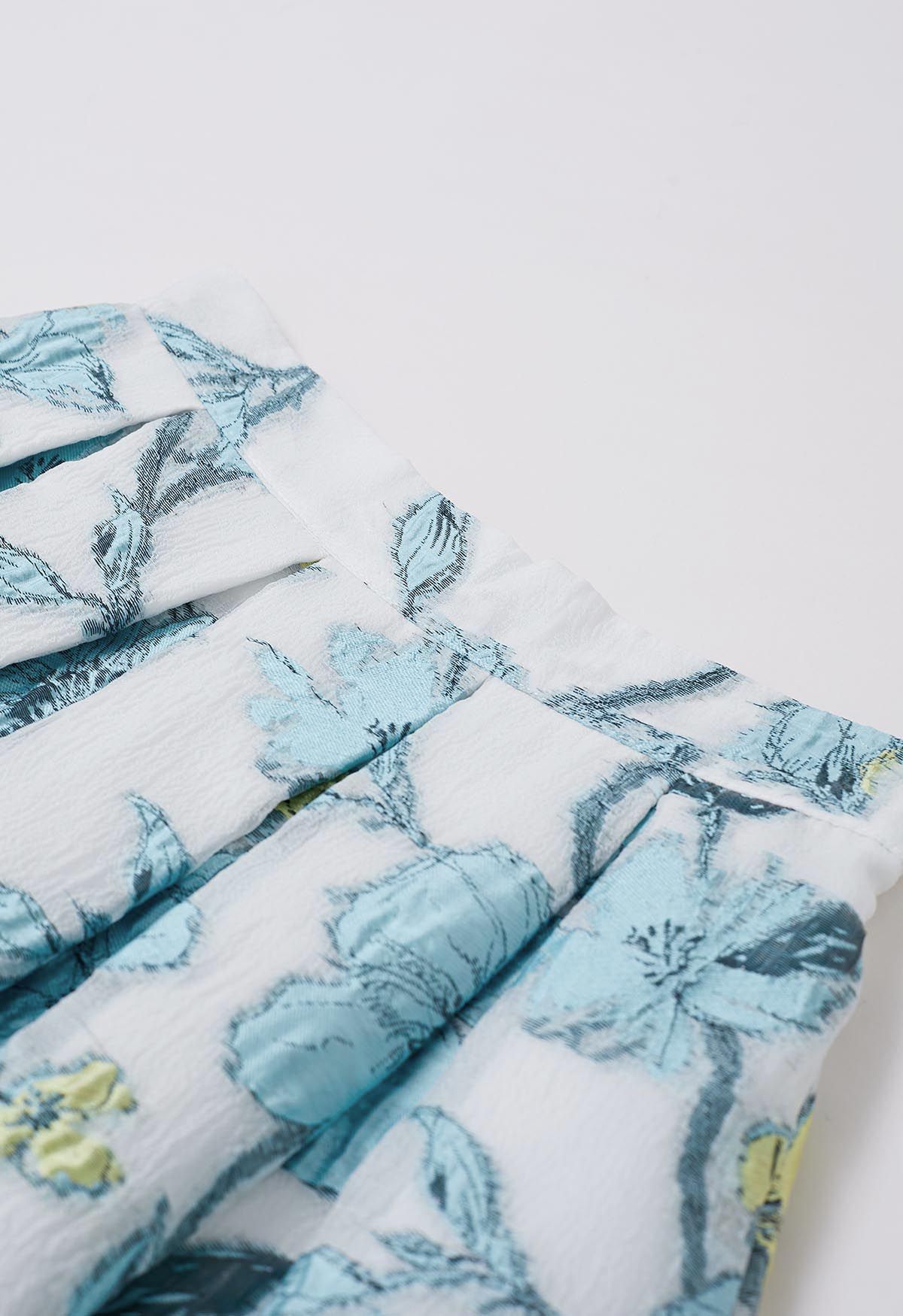The soothing ivory base is enhanced with an artistic aqua blossom floral print, delicately accented with hints of pastel lime and fine charcoal outlines. The floral design is inspired by hand-sketched botanicals, giving the skirt a refined yet contemporary appeal. Carefully designed pleats add volume and fluidity, creating a graceful silhouette that moves effortlessly with every step.