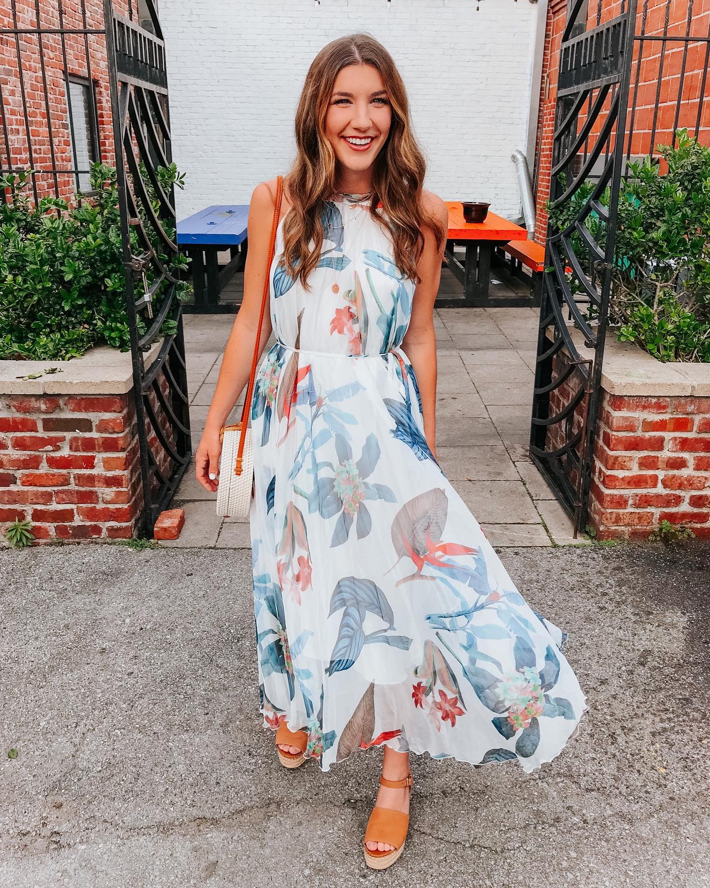 Ivory Tropical Botanical Leaf Printed Poly Chiffon Maxi Dress with Halter Neckline