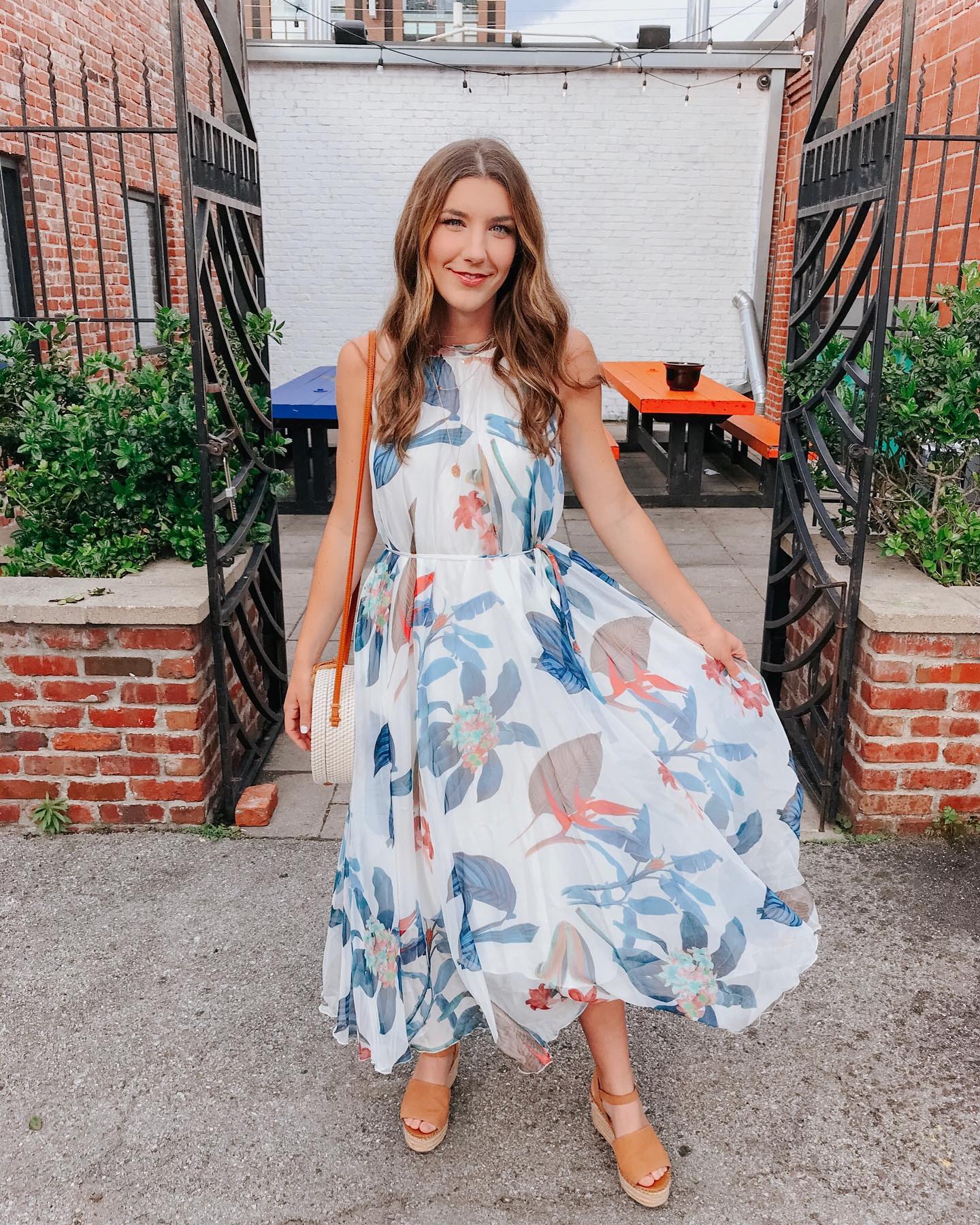 The dress showcases a Tropical Botanical Leaf & Floral Print, inspired by nature’s freshness and calm tones. Set on a clean ivory-white base, the print features artistic leaves and soft florals in soothing shades of blue, teal, and coral. This harmonious color palette lends a serene yet stylish appeal, perfect for daytime elegance as well as relaxed evening wear.