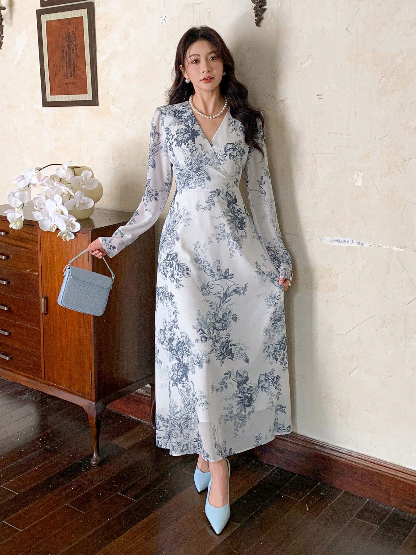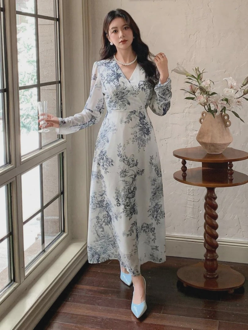 This Floral A-Line Maxi Dress is made from soft crepe fabric in an elegant ivory white color with a classic blue toile floral print. Featuring a V-neckline, full sleeves, and a flowy silhouette, it offers timeless elegance—perfect for brunches, parties, and graceful day-to-evening wear.