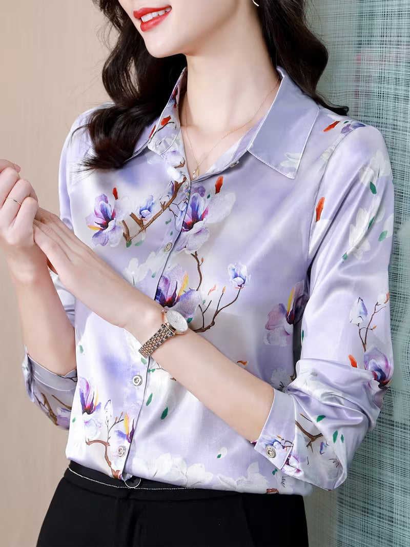 Elevate your everyday elegance with our Lavender Magnolia Blouse. Crafted from premium high-luster silk-satin, this blouse features a liquid-like drape that catches the light beautifully, creating a stunning iridescent effect. The centerpiece is a sophisticated watercolor floral print, showcasing hand-painted magnolia blossoms in soft shades of lilac, indigo, and violet.