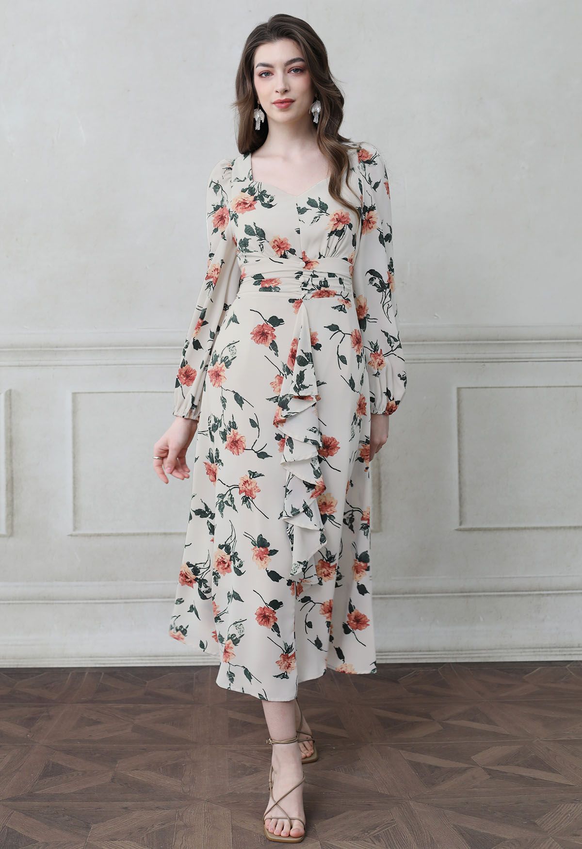 Marigold bloom ruffle front Abstract Printed full sleeve maxi dress