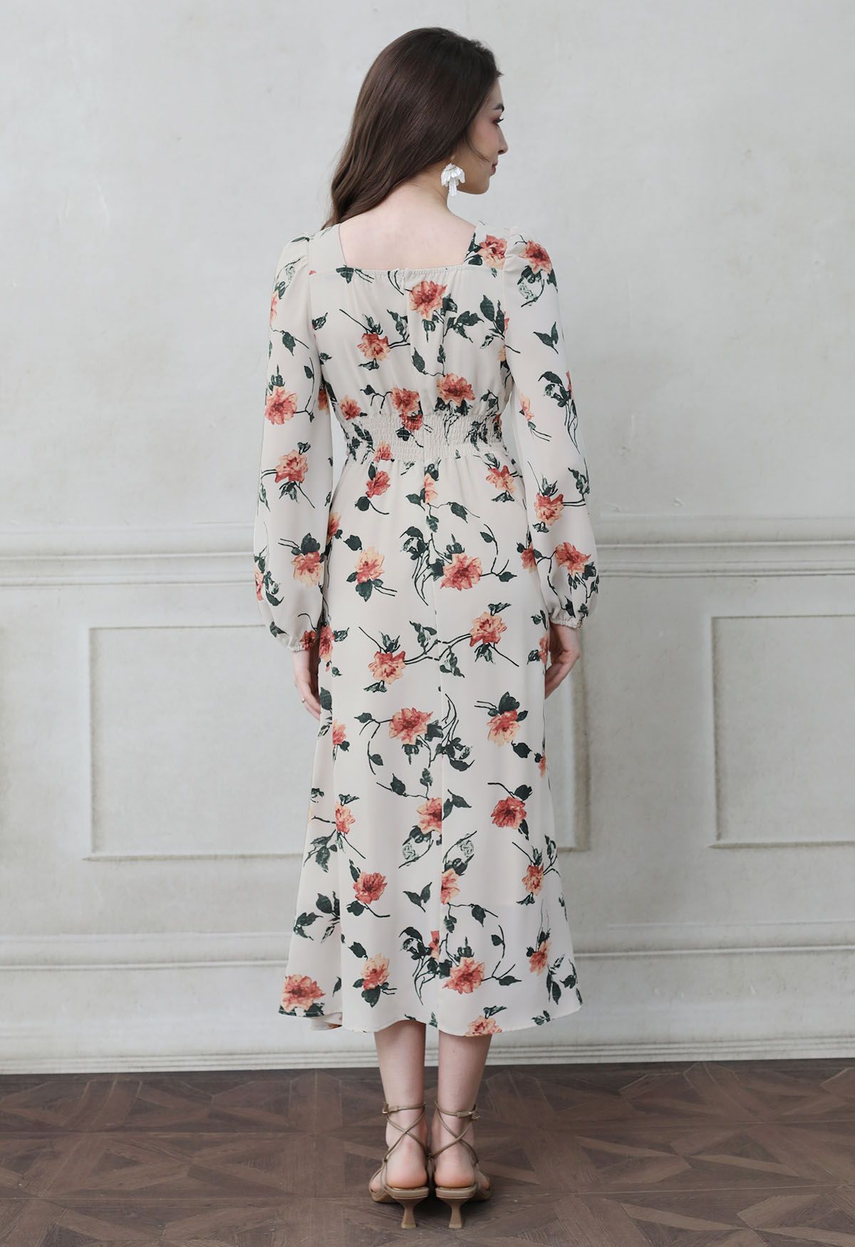 The dress comes with a high gathered neckline and delicate tie-up detail, offering a refined and feminine finish. The full-length sleeves with elasticated cuffs add a graceful volume while maintaining comfort. A softly elasticated waistline defines the silhouette beautifully, allowing the dress to flow effortlessly into a relaxed, airy midi-length hem.