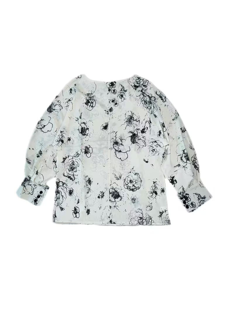 Monochrome Floral Puff-Sleeve Black floral motifs scattered across a white base Top