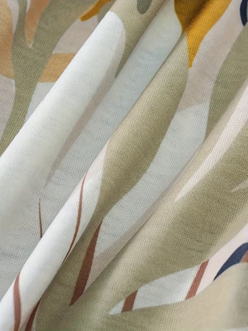 This elegant skirt is crafted from soft flowing crepe fabric that drapes beautifully with every movement. Designed with a comfortable elasticated waistband, it offers a relaxed yet flattering fit. The abstract tropical leaf print in earthy and muted tones adds a modern, nature-inspired charm. Lightweight and airy, this skirt is perfect for everyday wear, vacations, or effortless day-to-evening styling. Pair it with a solid top or blouse for a chic, balanced look.