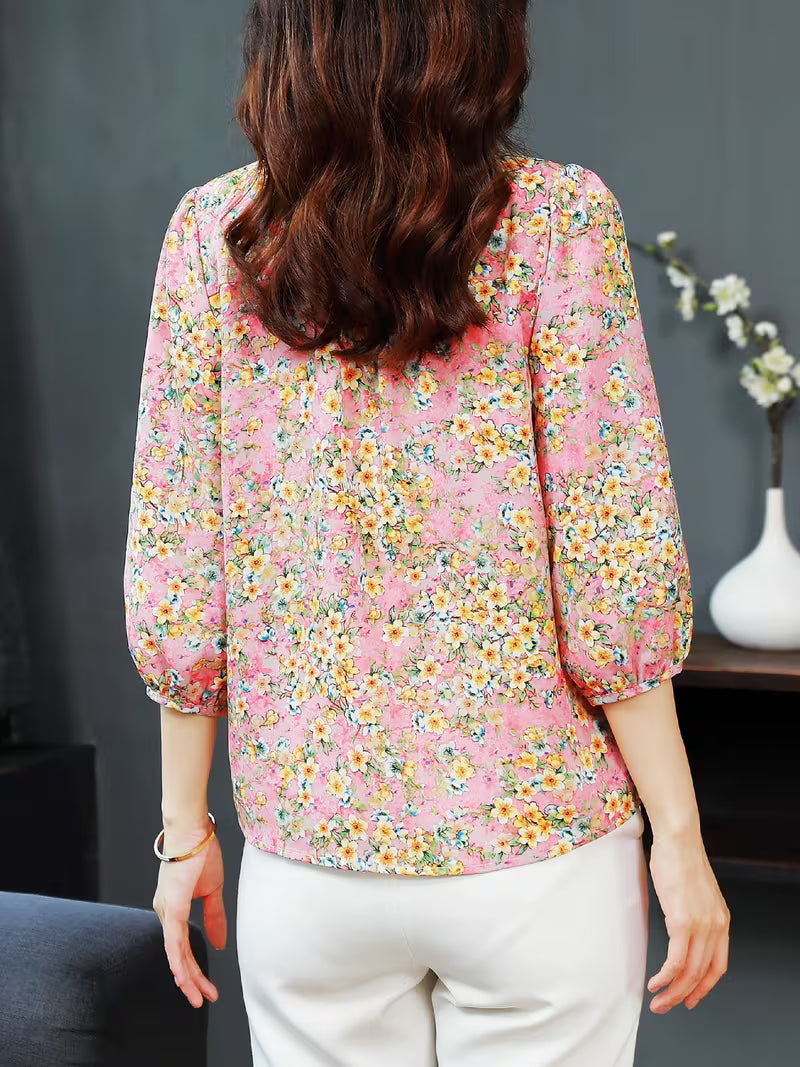 This elegant floral Top is the perfect blend of feminine charm and professional style. Crafted from a lightweight, breathable chiffon fabric, it features a vibrant botanical print in soft pink and yellow tones. The design stands out with a delicate ruffled V-neckline and a classic button-down front, offering a sophisticated vintage appeal.
