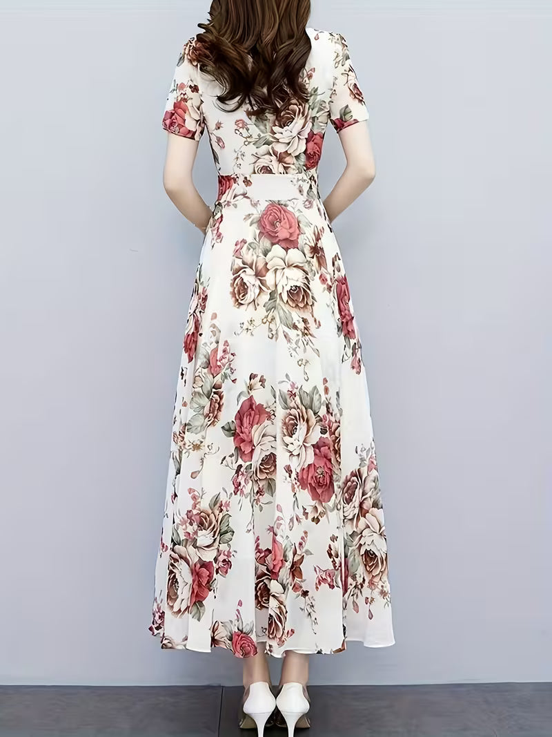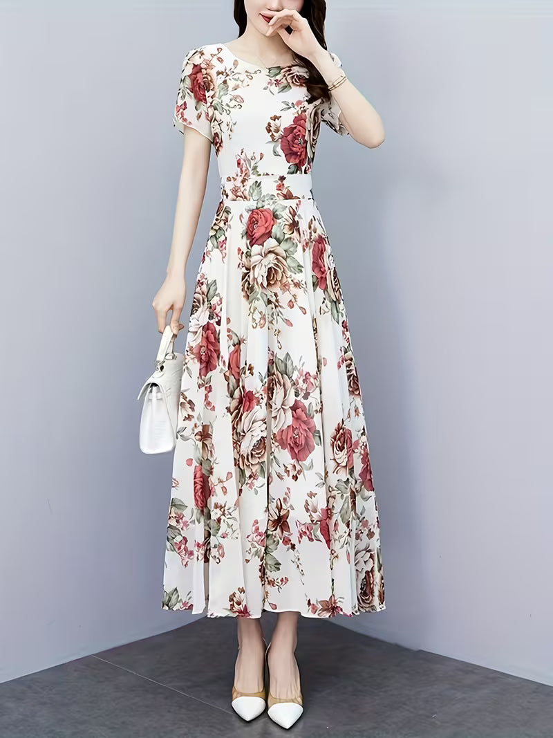 Short Sleeve Round Neck Retro Rose Botanical Print Floral Chiffon Long Dress