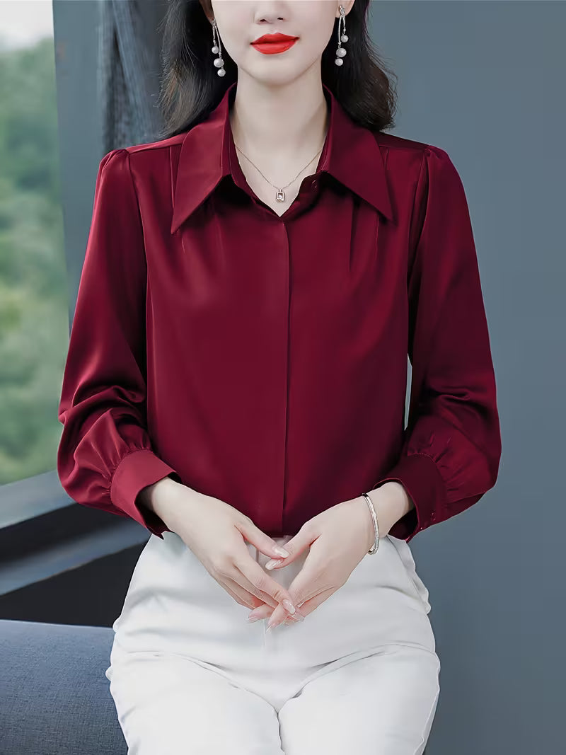 Crafted from premium Mulberry Silk, this blouse features a signature Satin weave for a lustrous, liquid-like sheen. The breathable, medium-weight fabric creates an elegant drape, highlighting the sophisticated bishop sleeves. Its rich wine-red hue and temperature-regulating properties make it a luxurious choice for both office wear and evening events.