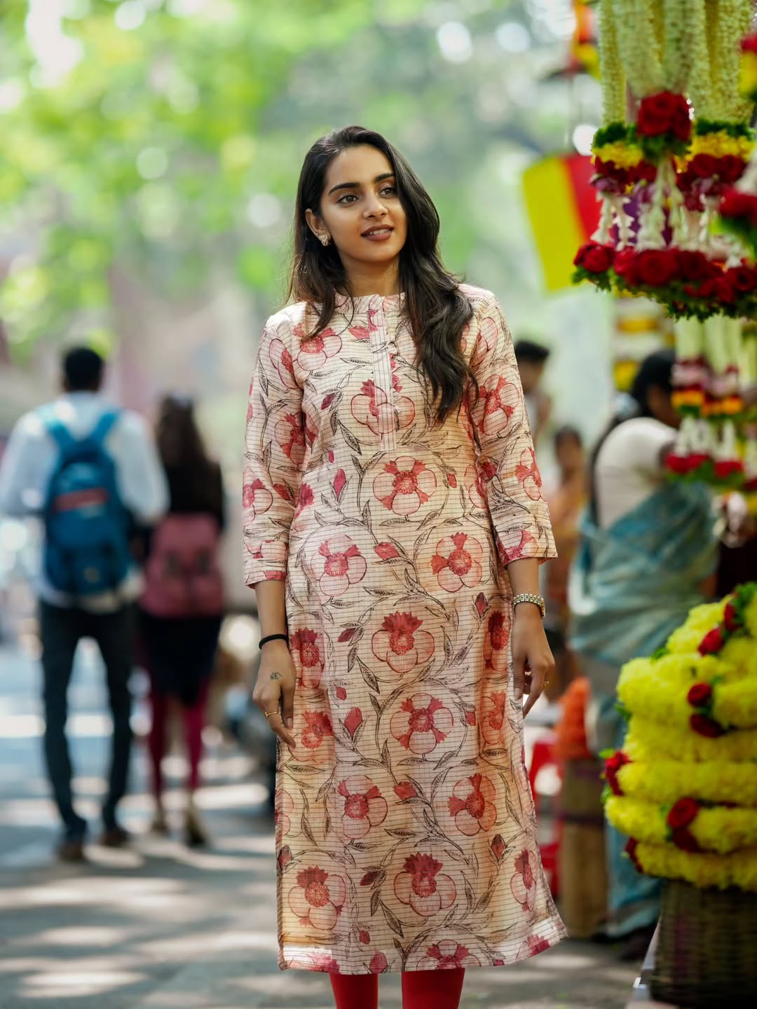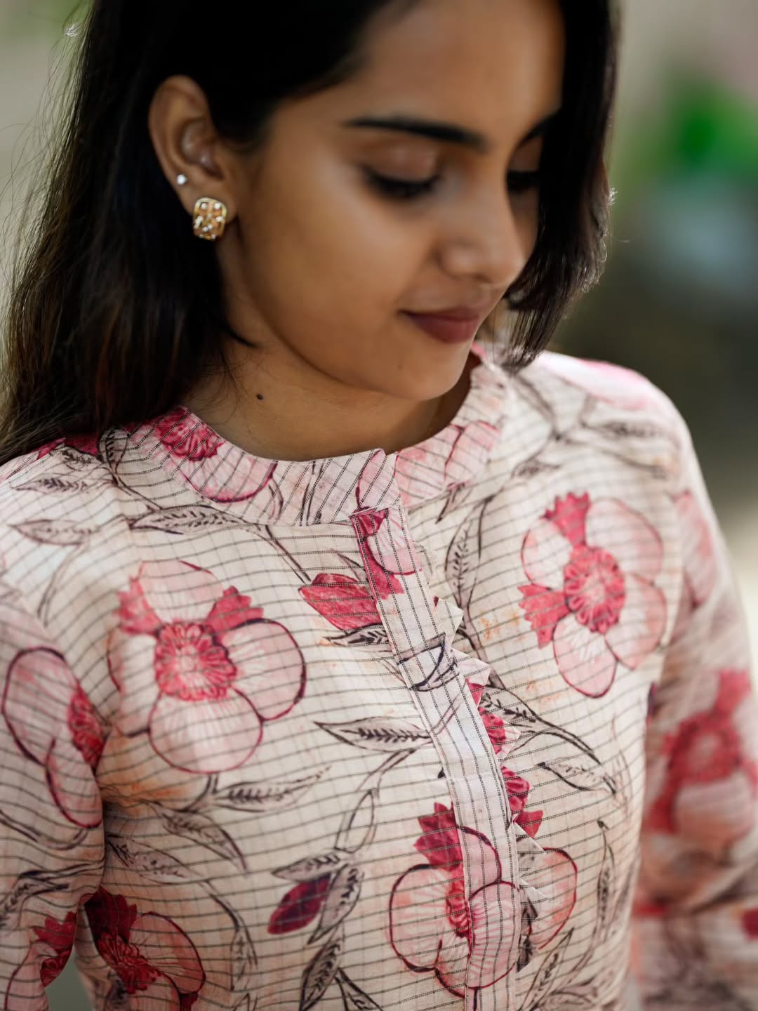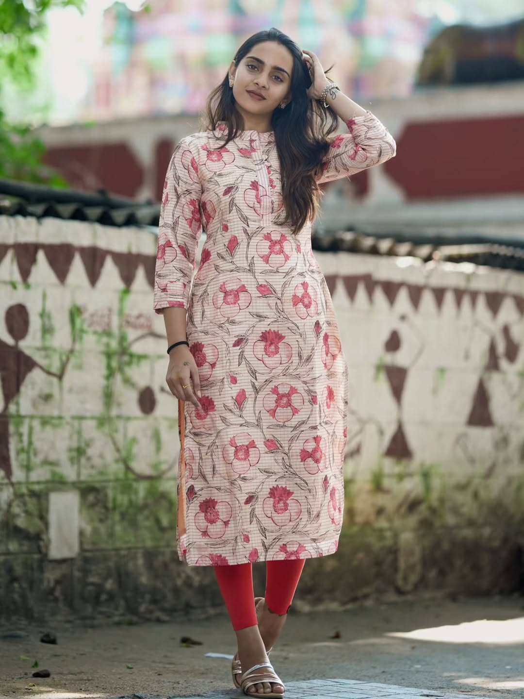 Soft Cream Base with Rose Pink & Light Brown Floral Print kurti