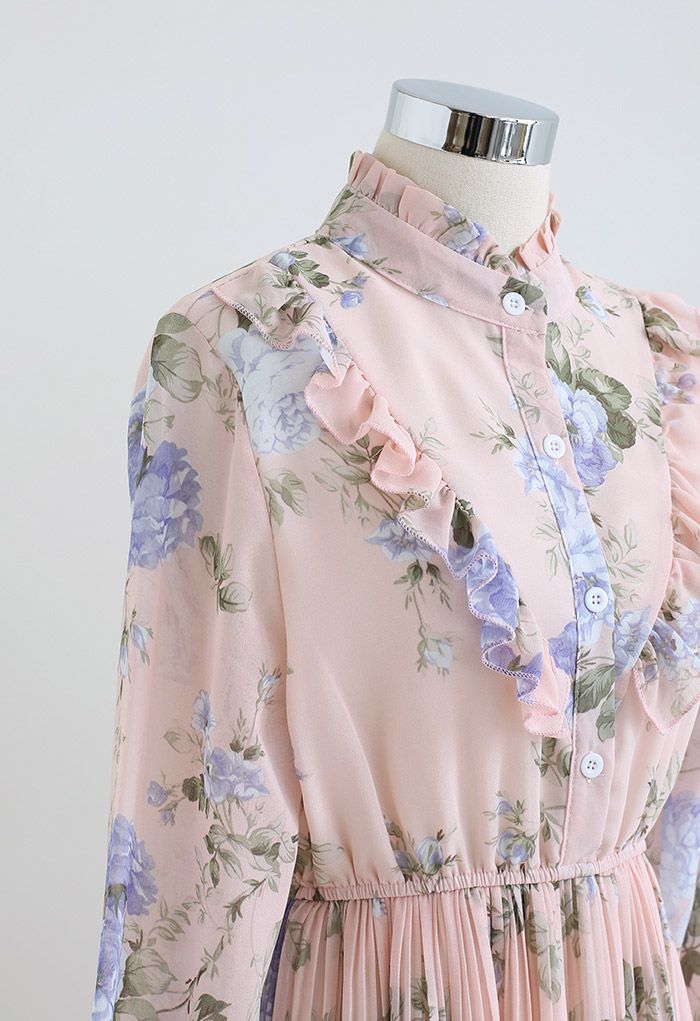Soft Peach Garden Floral Printed Midi Dress with Ruffle Yoke Elegant Long Sleeve Pleated Silhouette in Lightweight Flowing Fabric for Daytime & Occasion Wear
