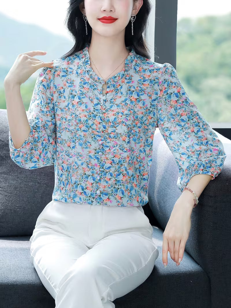 This elegant blouse is crafted from premium Polyester Chiffon, celebrated for its ethereal lightness and sheer finish. It features a vibrant Vintage Floral Print, contrasting a serene Powder Blue backdrop with rich Burnt Orange and Deep Coral blossoms. The intricate botanical pattern offers a timeless aesthetic suitable for both professional and social settings.