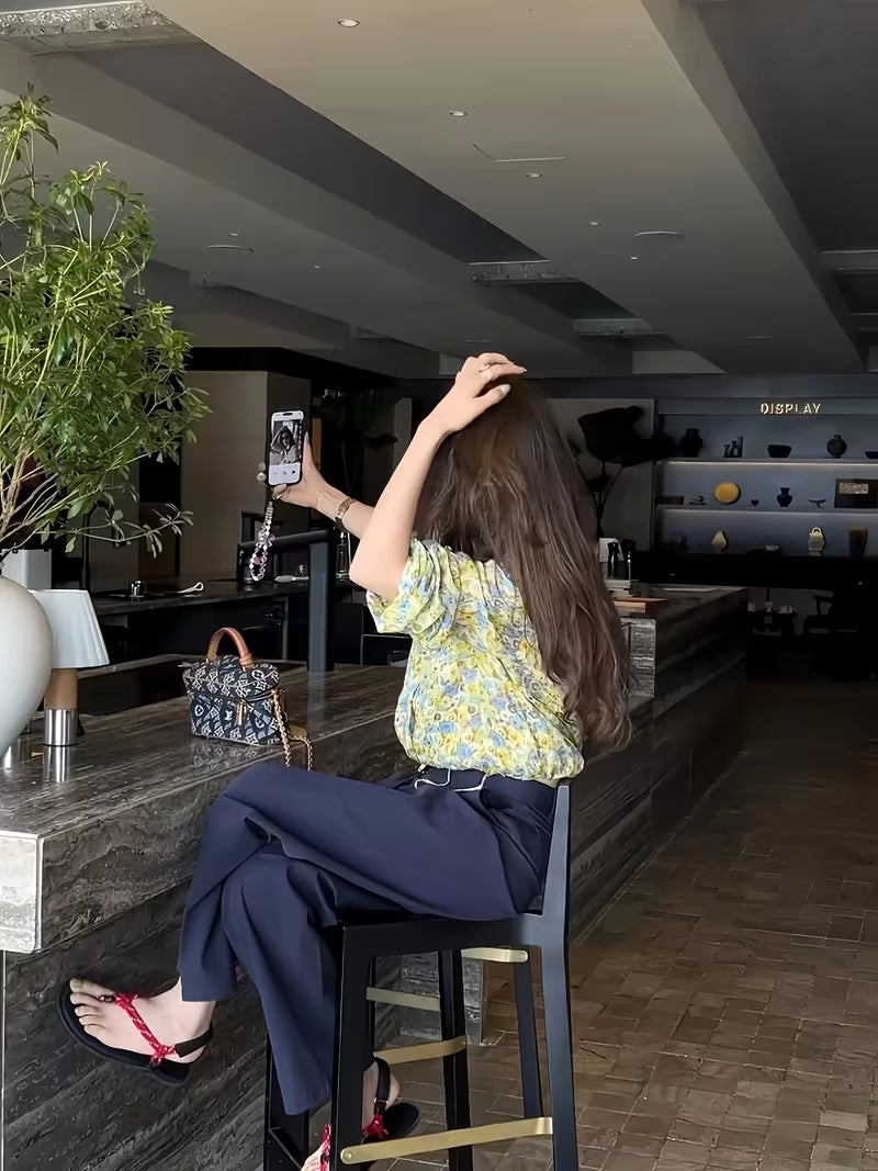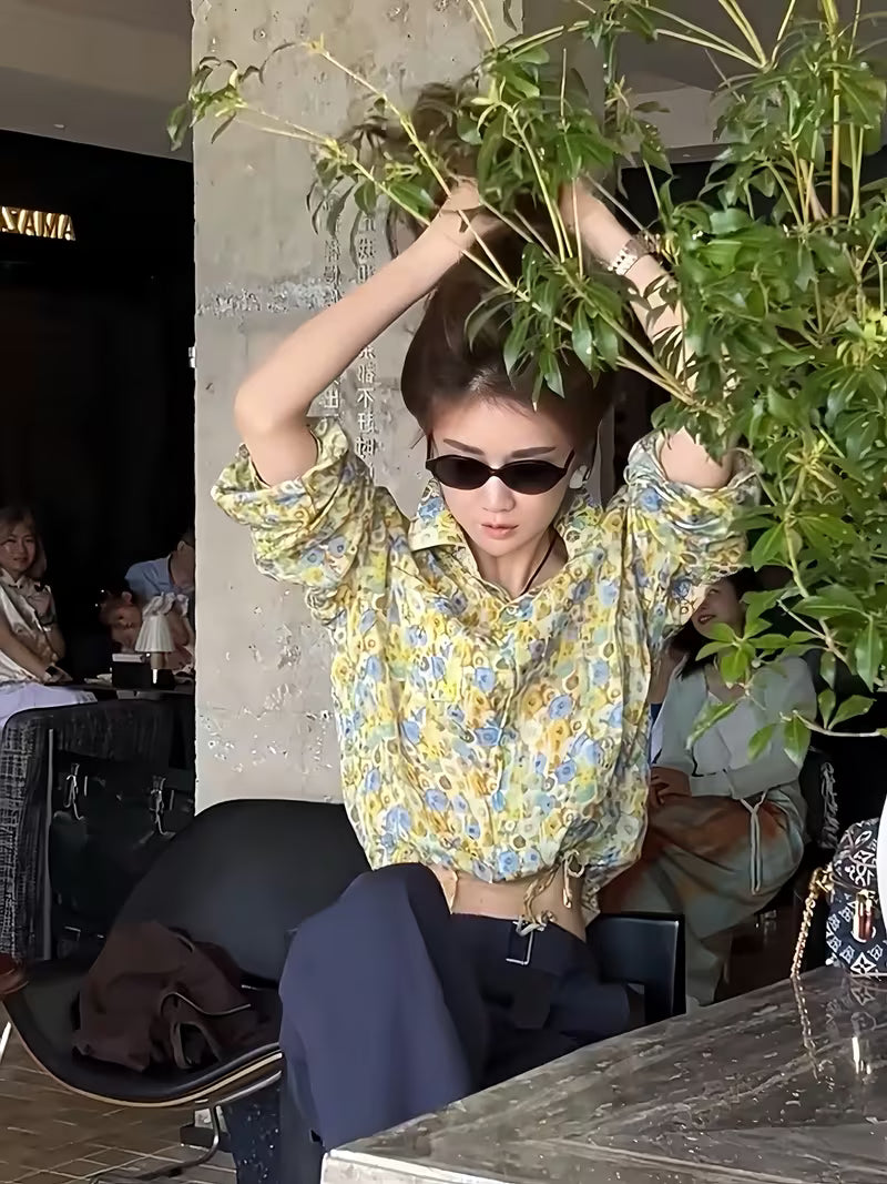 This stylish top is crafted from soft chiffon fabric featuring a delicate watercolor floral print. The subtle cream base paired with pastel yellow, blue, and green floral motifs gives it a fresh and elegant look. Lightweight and breathable, it ensures all-day comfort while the button-down front and adjustable drawstring hem add a modern touch. Perfect for office wear, brunch outings, or casual evenings, this top pairs beautifully with trousers, skirts, or denim.
