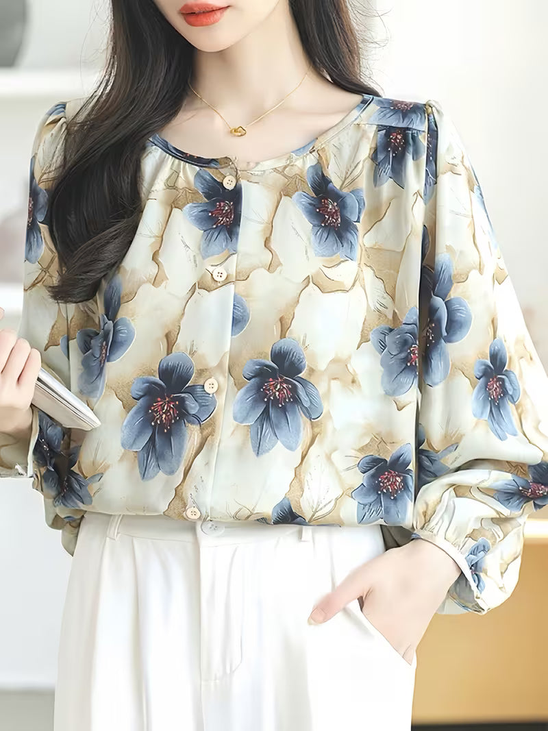 This elegant Top features a dreamy floral print with oversized blue petals, Top