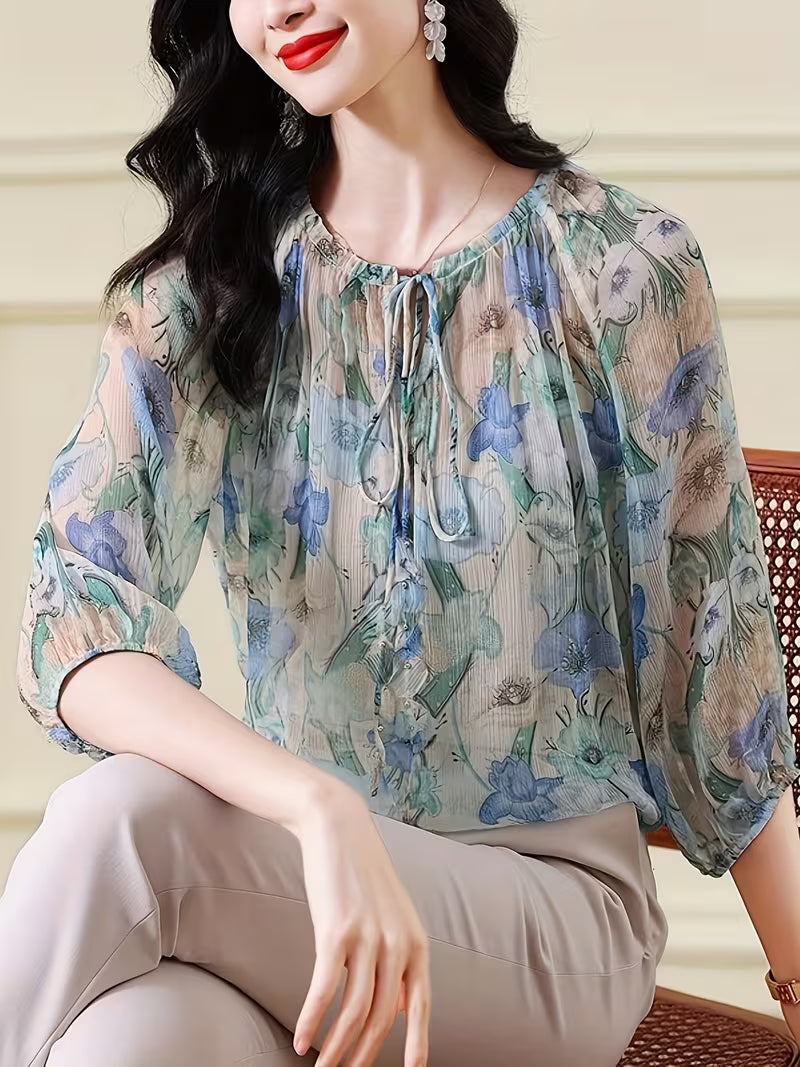 This ethereal Top features a delicate floral print in calming shades of blue, green, and beige, set against a sheer organza georgette base. The gathered neckline with a subtle tie adds a touch of vintage charm, while the three-quarter sleeves offer a breezy silhouette perfect for warm days or layered styling. The fabric is ultra-light and semi-transparent, giving the top a dreamy, floaty feel that’s both elegant and feminine. Paired with neutral trousers and accessorized with leaf-shaped earrings, a dainty necklace, and a wristwatch, the look is soft yet polished — ideal for brunches, garden parties, or semi-formal gatherings. The floral motifs evoke a natural freshness, while the sheer texture adds sophistication. This blouse is a standout piece for those who appreciate graceful prints and lightweight comfort.