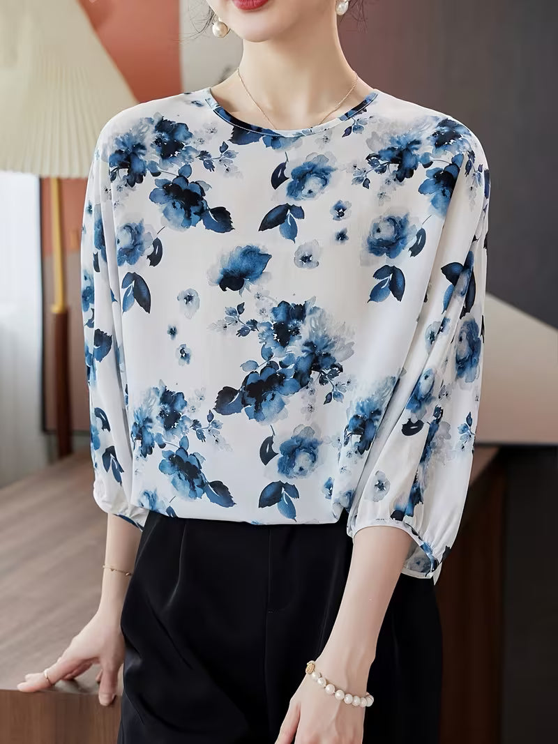 This refined Top showcases a delicate floral print in shades of blue, set against a crisp white background. The design features wide three-quarter sleeves and a round neckline, offering a relaxed yet polished silhouette. Crafted from a satin silk blend, the fabric feels luxuriously smooth with a subtle sheen that enhances the vibrancy of the floral pattern. The blouse is lightweight and breathable, making it ideal for both casual and semi-formal occasions.