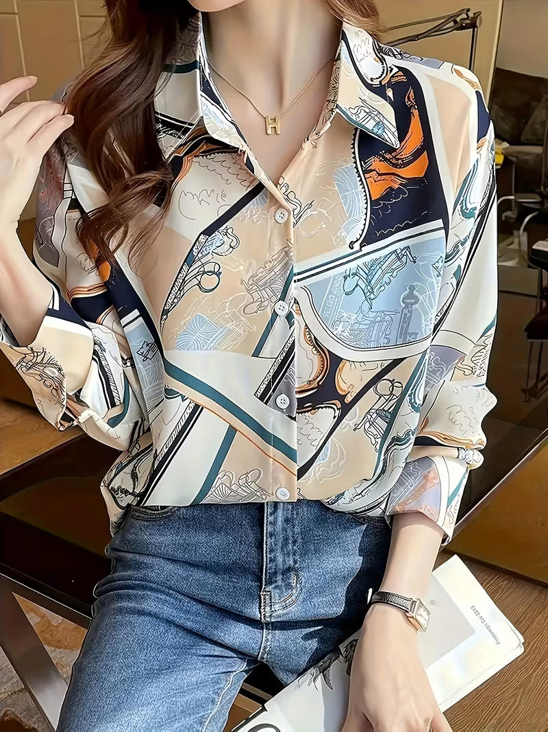 This stylish button-up shirt features a unique blend of abstract and illustrative designs, combining geometric shapes with artistic brushwork in a palette of navy blue, light blue, orange, and beige. Crafted from poly crepe fabric, it offers a lightweight and smooth texture that drapes elegantly while maintaining structure. The pointed collar and button-down front add a touch of formality, making it suitable for both casual and semi-formal settings. Paired with high-waisted blue jeans and accessorized with a gold "H" pendant necklace and a silver wristwatch, the look is effortlessly chic. The shirt’s breathable fabric ensures comfort throughout the day, while the vibrant print adds personality and flair. Ideal for creative professionals, weekend outings, or stylish office wear, this piece is a perfect blend of comfort, color, and character. A standout choice for those who appreciate bold design with refined execution.