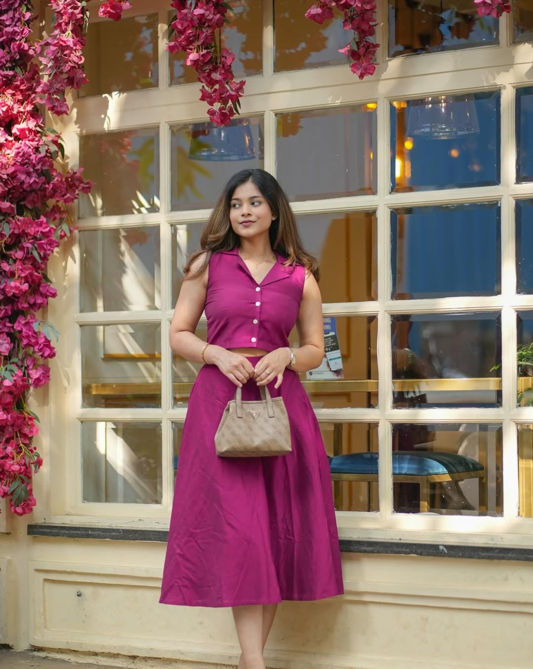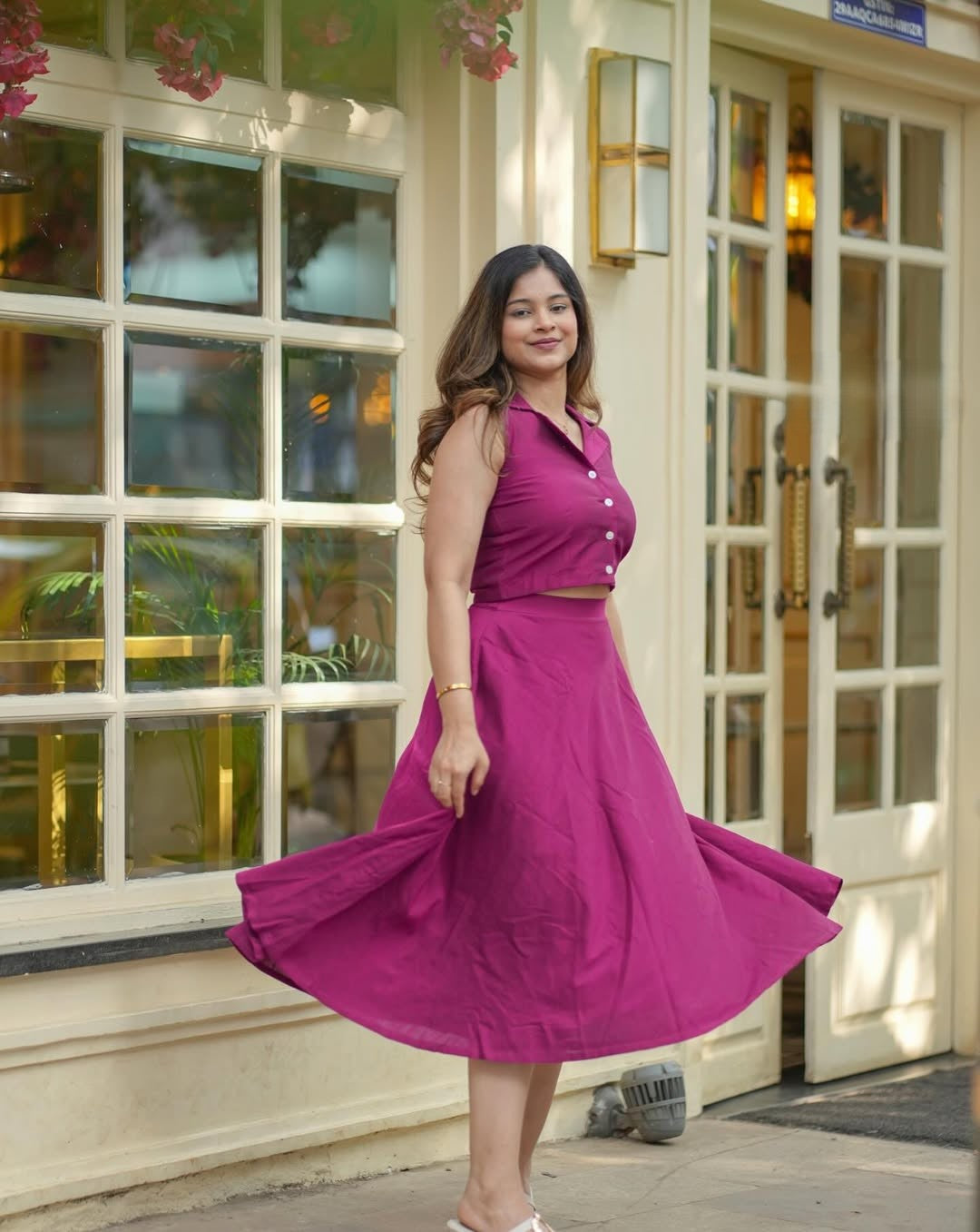 This stylish women’s co-ord set is made from soft cotton blend fabric in a rich wine color. It features a sleeveless button-down crop top paired with a high-waist flared midi skirt. Comfortable, trendy, and elegant, this outfit is perfect for casual outings, brunches, vacations, and daily wear.