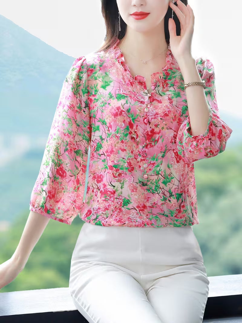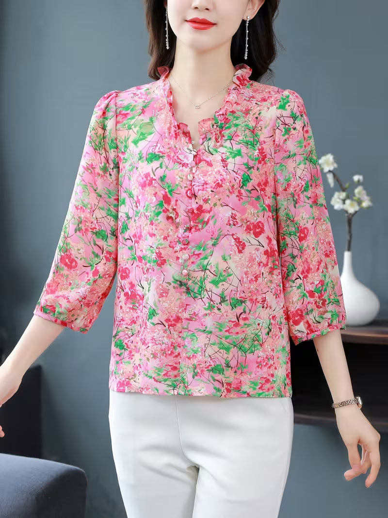 Elevate your wardrobe with our Elegant Pink Floral Chiffon Blouse, where timeless romance meets modern sophistication. Crafted from premium, lightweight chiffon, this top features a delicate vintage-inspired botanical print that adds a touch of freshness to any outfit. The design is highlighted by a feminine ruffled collar and a graceful V-neckline, perfectly complemented by 3/4 length sleeves with elasticated ruffled cuffs. Its relaxed, flowy silhouette ensures maximum comfort without sacrificing style. Whether tucked into a high-waisted skirt for the office or paired with casual denim for a weekend brunch, this versatile piece is a seasonal essential.