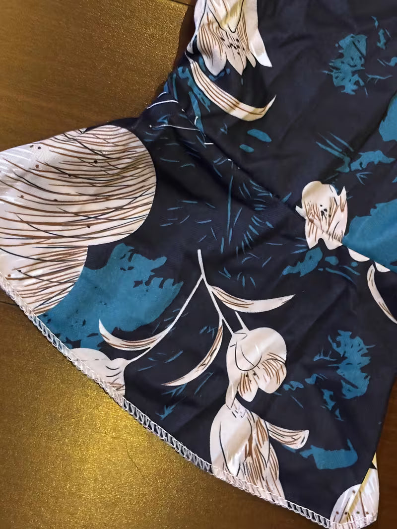 "This dress features a breathable chiffon fabric adorned with a sophisticated botanical print. The flutter sleeves and cinched waist offer a flattering silhouette, making it an ideal choice for garden parties, evening dinners, or formal outings."