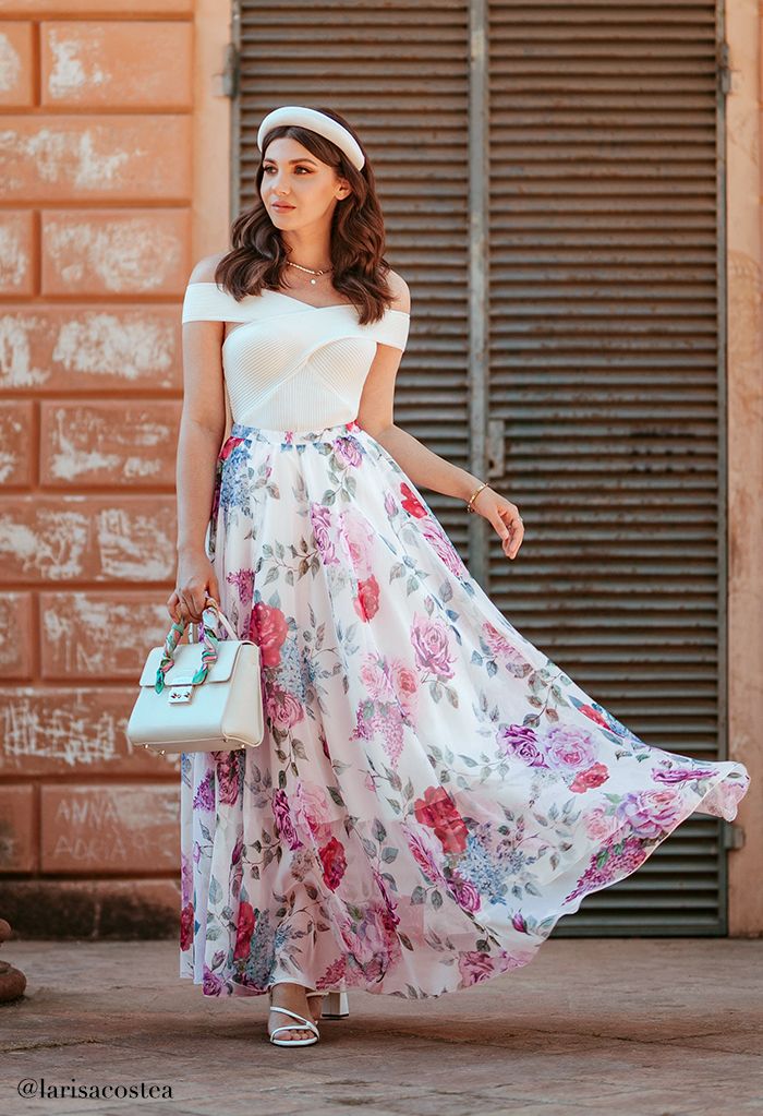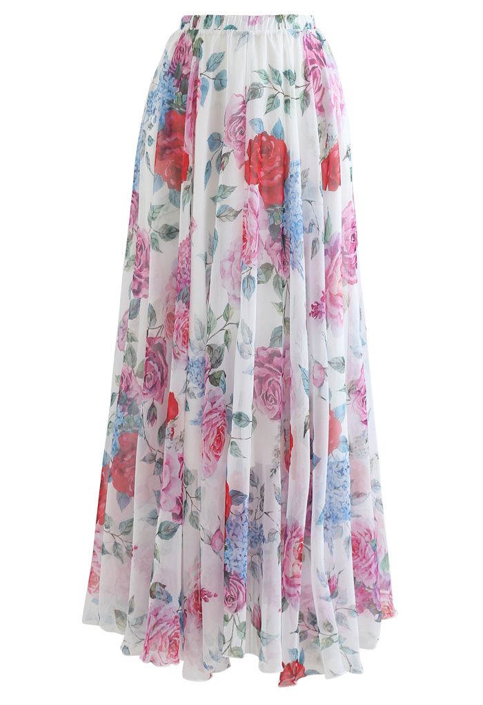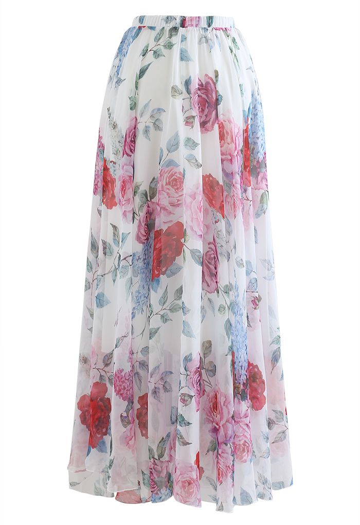 White rose and hydrangea floral chiffon maxi skirt elastic waist