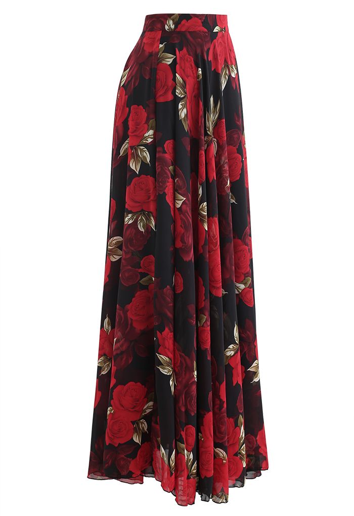Women Midnight Rose Red Floral Printed Maxi Skirt Flowing Lightweight Chiffon Fabric with Soft Draped Silhouette for Romantic