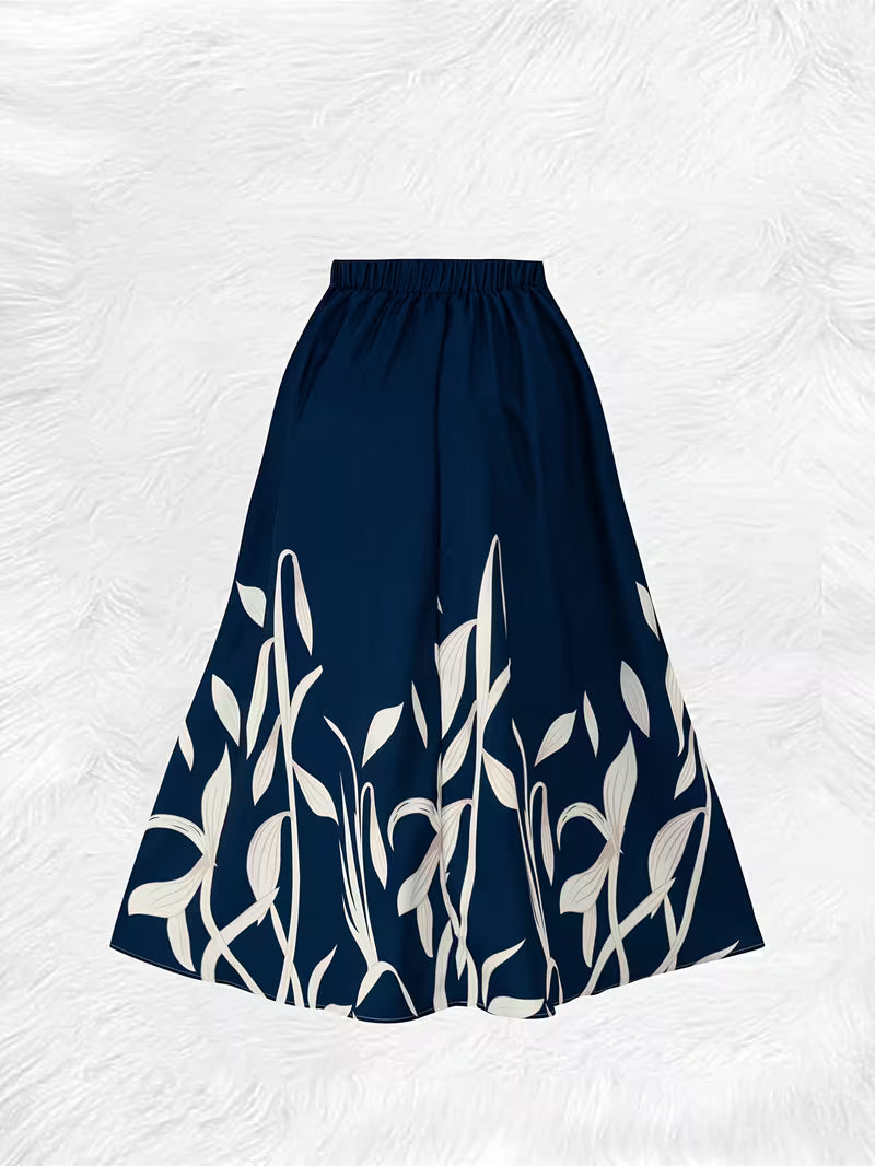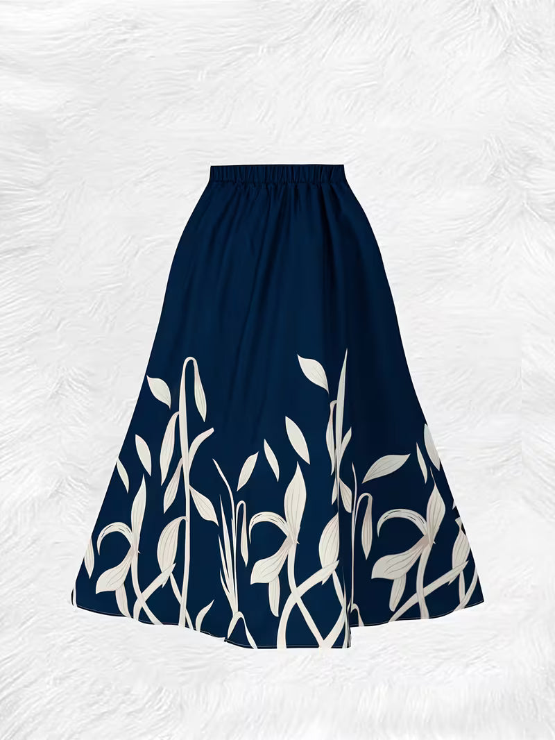 Women’s Navy Blue Leaf Printed Long Skirt
